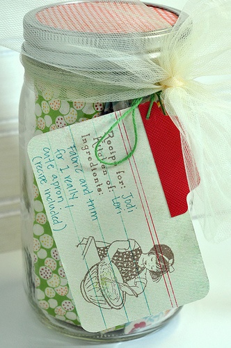 I think this apron in a jar is the CUTEST! The tag gives you the “recipe” for the apron and the jar contains everything you need to create the recipe! I think it would be adorable, too, with a finished apron inside with a food recipe attached for cookies or some other sweet.