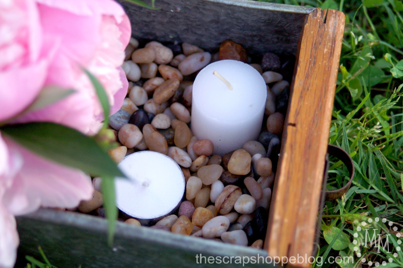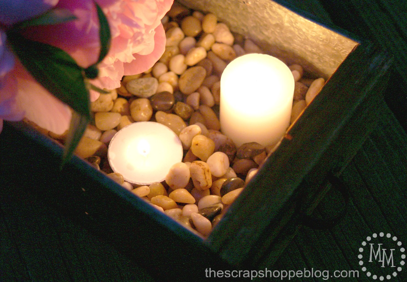 Add the pebbles to the rectangular container then place 1 or 2 votives (and/or tea lights – I like the combination of the two) into the pebbles but make sure they are not under the flowers.