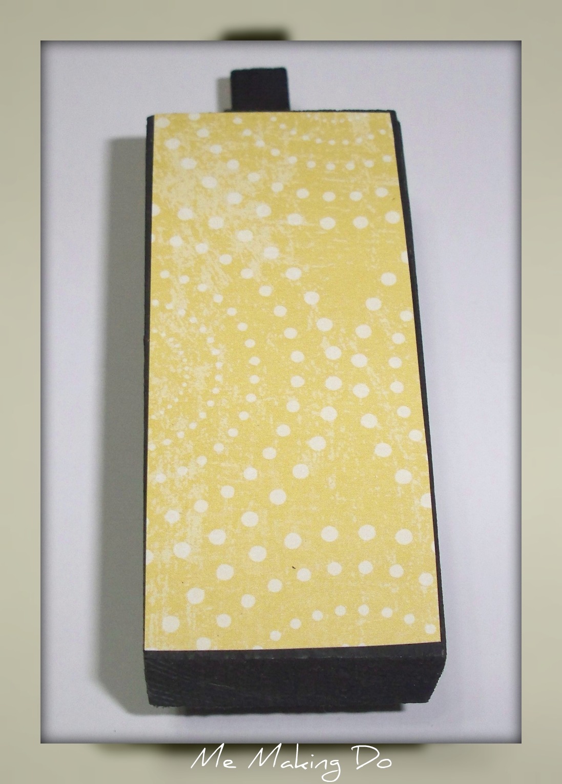Cut another piece of patterned paper and add to the top of the clothespin, and another small piece to add on the bottom of the holder on top of the other piece already modge podged on.