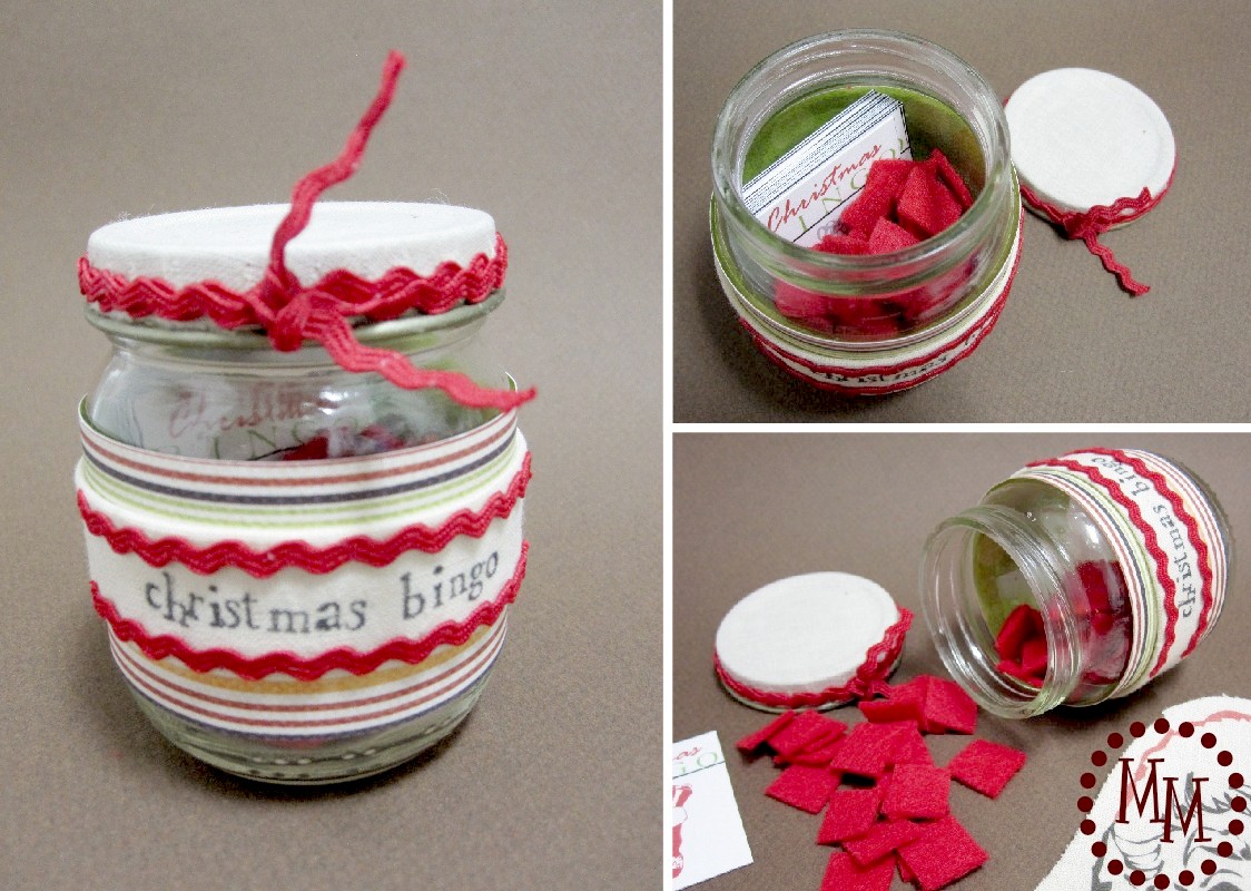 To keep up with the felt tokens, I dressed up an old baby food jar with scrapbook paper, scrap muslin, and ric-rac to store them in. The bingo image cards are small enough to store in there, too!