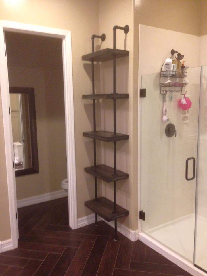 Build a shelf from the floor to the top of the door frames or ceiling using pipes and stained wood.
