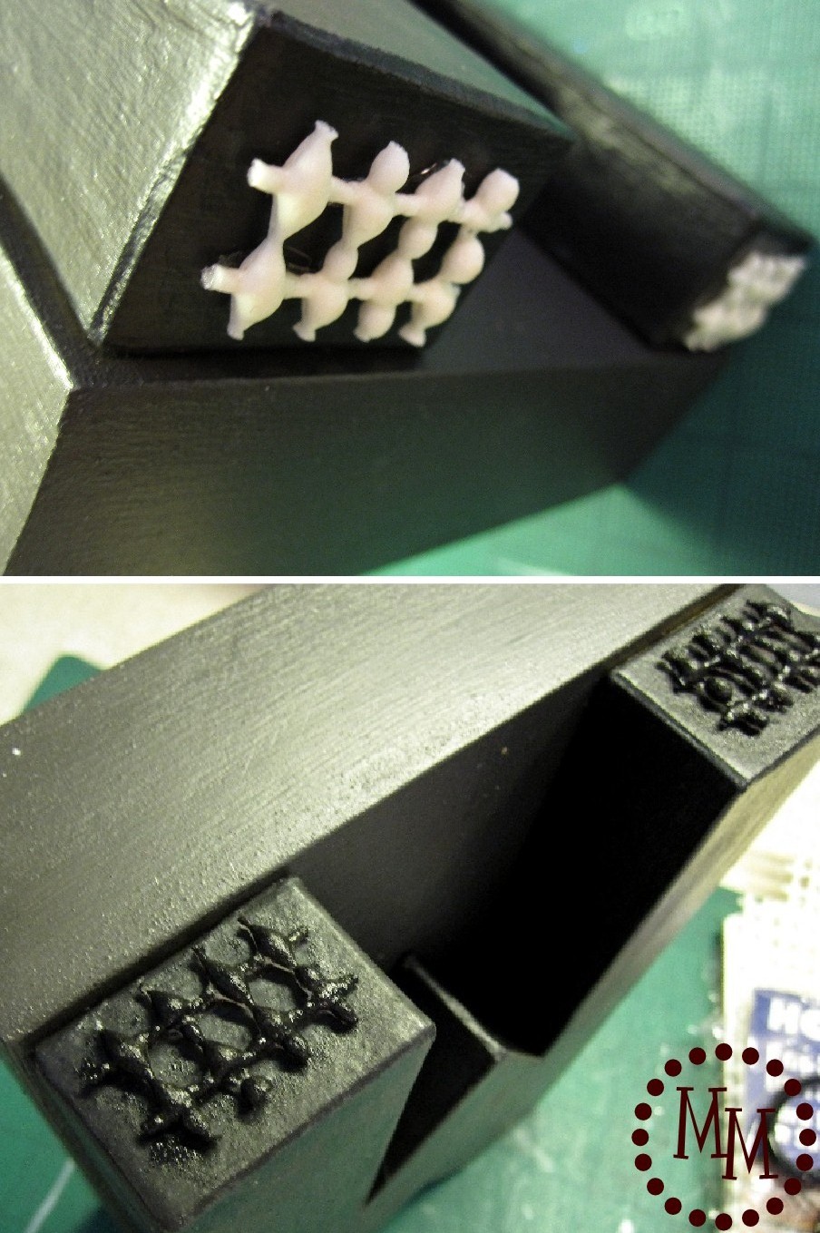 Although the letter was made of paper mache, it still made the front of the stamp a little forward heavy when it was standing upright. And with that 1/4″ gap on the bottom of the stamp, it had a tendency to tilt slightly forward. To remedy that I added a small bit of that material you put under your rugs so they don’t move around. Then I painted it black so as not to be noticed.