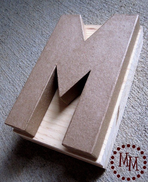 I used a large paper mache monogram letter and a couple of pieces of wood cut about a 1/4″ larger than the letter.