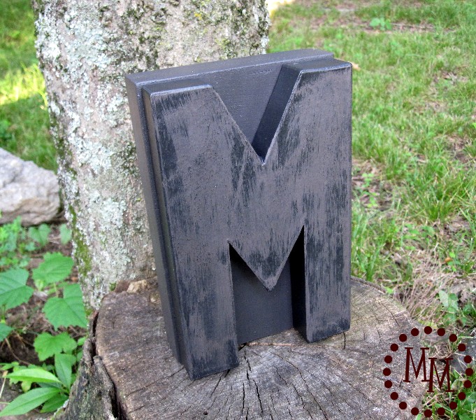 I painted the M the same color as the block. Then I mixed some brown, black, and gold acrylic paint and brushed it lightly over the top of the M, making sure not to give it good coverage. Then I quickly wiped much of the paint back off.