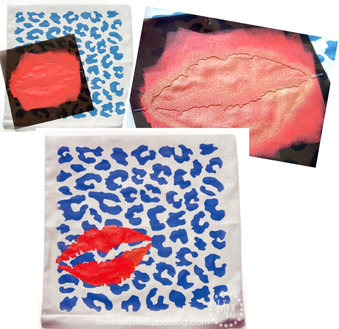 Once the paint for the leopard spots was dry, I applied the spray adhesive to the matte side of the lips stencil and placed it directly on top of the leopard print. I rolled on a coat of the Tomato paint color. Once the Tomato paint was dry I went back and dabbed the lips with the Penny Metallic paint color using the end (flat side) of the foam roller. This gave the lips a fun metallic sheen.