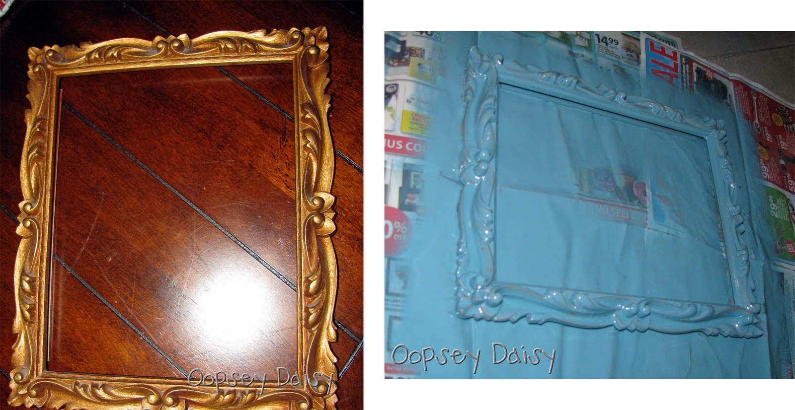 I started off with this gold and slightly gaudy frame that I picked up at Good Will for just a couple of dollars. Score! But it definitely needed a new color. A splash of turquoise spray paint was just perfect!