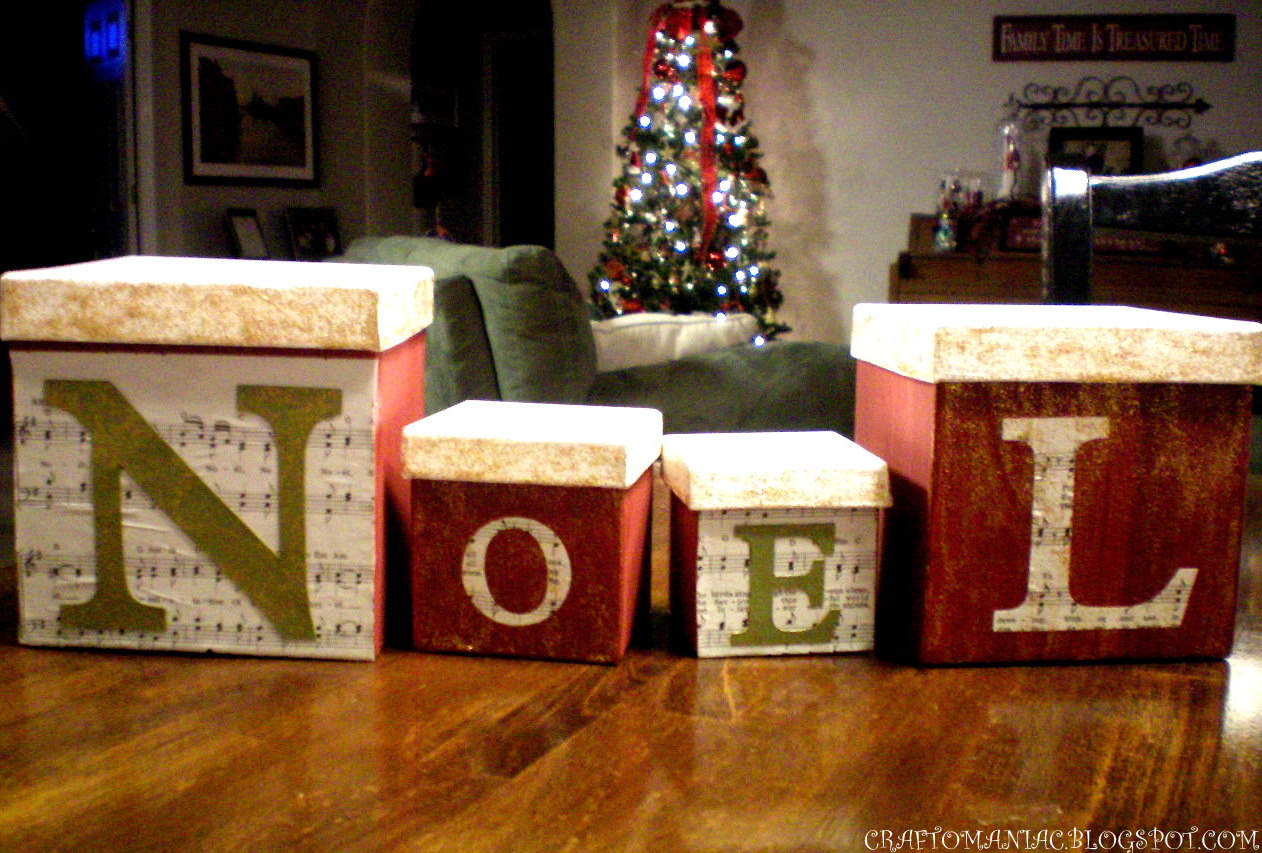 Hello I am Jennie, or “Jen” the Author and Craft Disorder Junkie from CraftOManiac. I opened and started my Craft blog February this year, it has been loads of fun. Today I AM THRILLED to be a part of Micheles Homemade Christmas Party. Today I will be showing you how I made these cute Dollar Store NOEL boxes. I love the Christmas song “NOEL” its a fav. for sure.