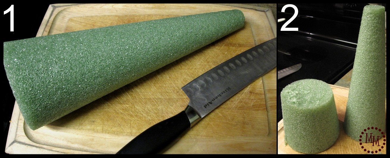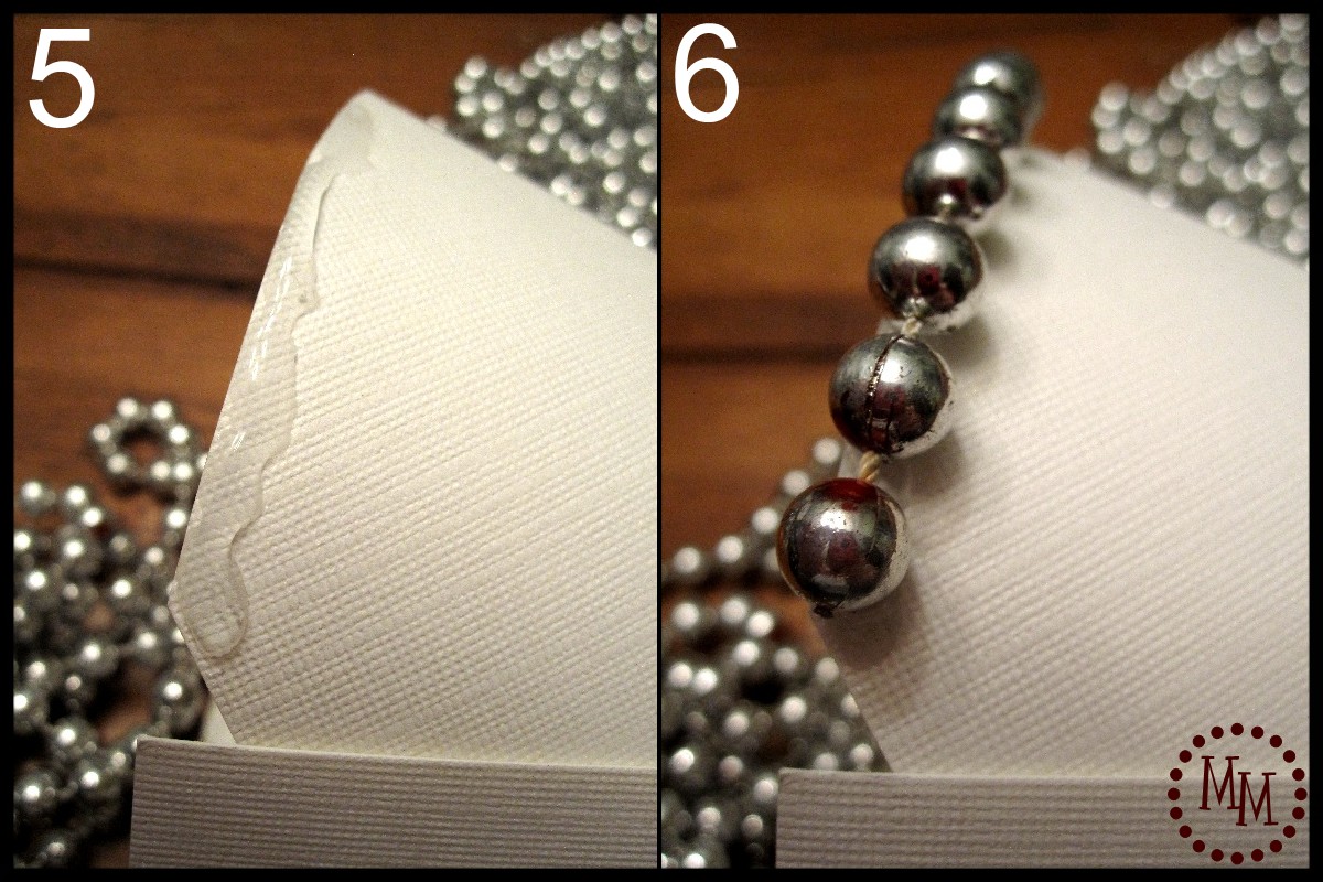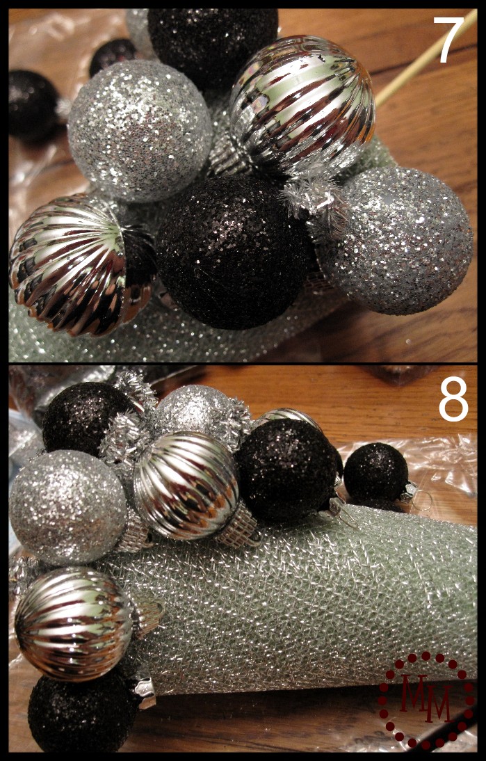 5-6. I wrapped the cone in some silver mesh so the adhesive would have something to grab on to (and not make craters in my styrofoam!).
