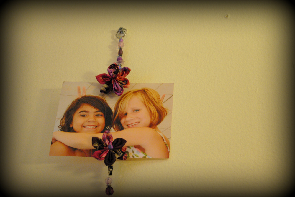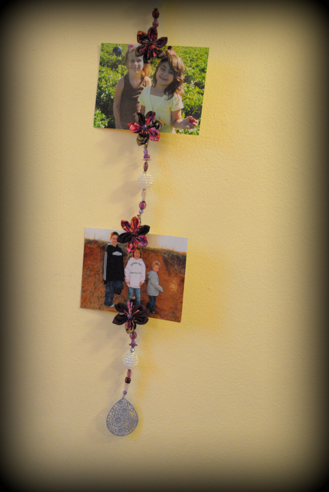 Today I am showing you how to make a beaded picture hanger. I saw something similar in a local store here, but decided it would be simple enough to figure out my own variation. My daughter has one hanging from her curtain rod, and she loves to switch out her friend’s pictures.