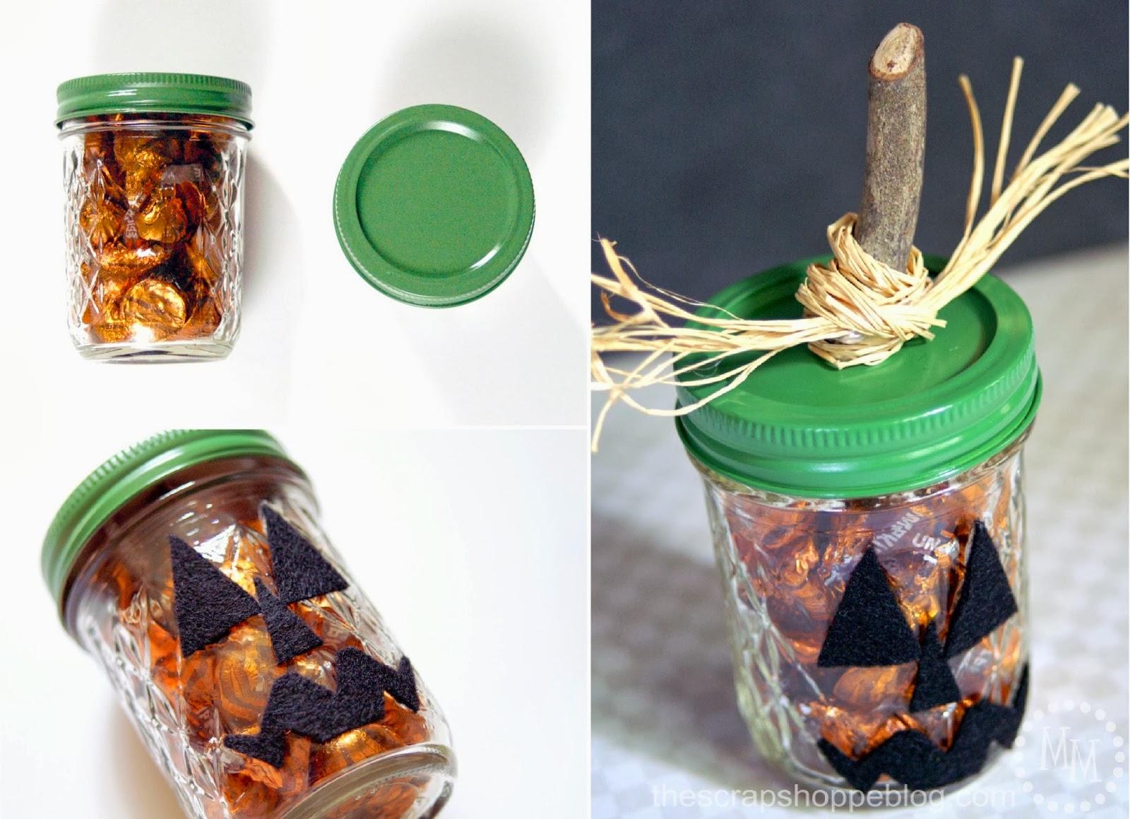 For the smallest jar I simply added two triangle eyes due to its short size. I think it still gives the jack-o-lantern effect. Especially when paired with his taller buddies.