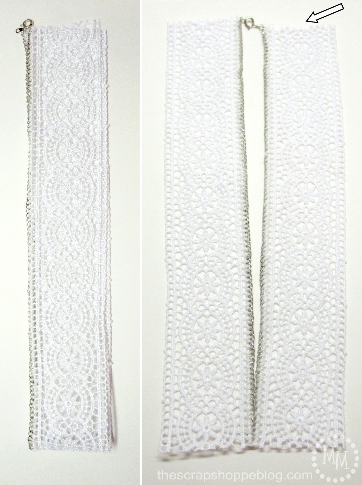 1. Tie a knot with the embroidery floss around the end of the chain and the end of the lace.