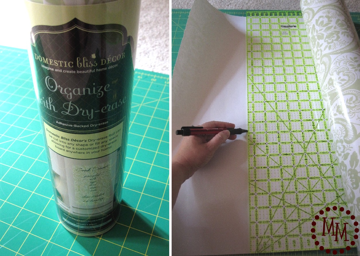 The dry erase sheets were a cinch to use. There were two large sheets (I only used 1 for both doors!) in the roll. I simply measured the inside panels on my doors then transferred those measurements onto the dry erase sheet and started cutting. Easy peasy!