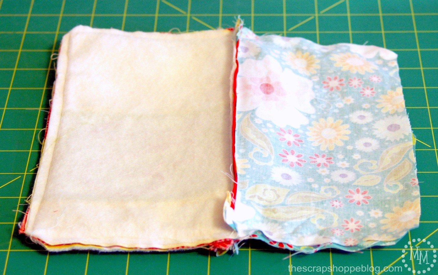 I sized and printed an “M” out from my computer on cardstock that I cut out to use as a template. I used Steam-a-Seam on the back of the red apple fabric (follow directions on packaging) then placed the fabric face down and traced the reverse image of the cardstock M on the Steam-a-Seam backing. Cut out the M and follow directions to iron it to the green fabric. I then stitched along the M with the sewing machine to dress it up further.