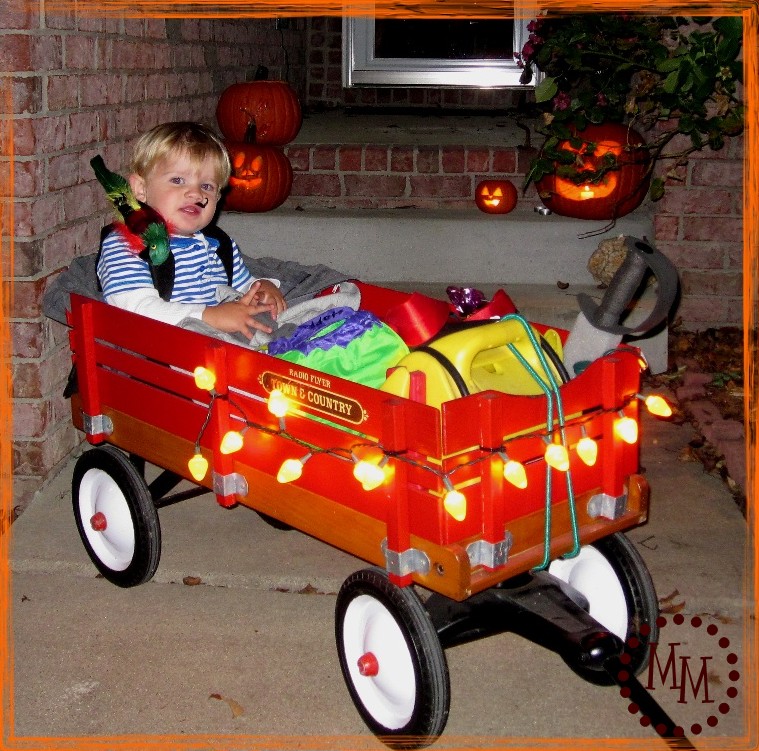 We started off in the wagon to which the hubs geniously hooked up our candy corn lights.