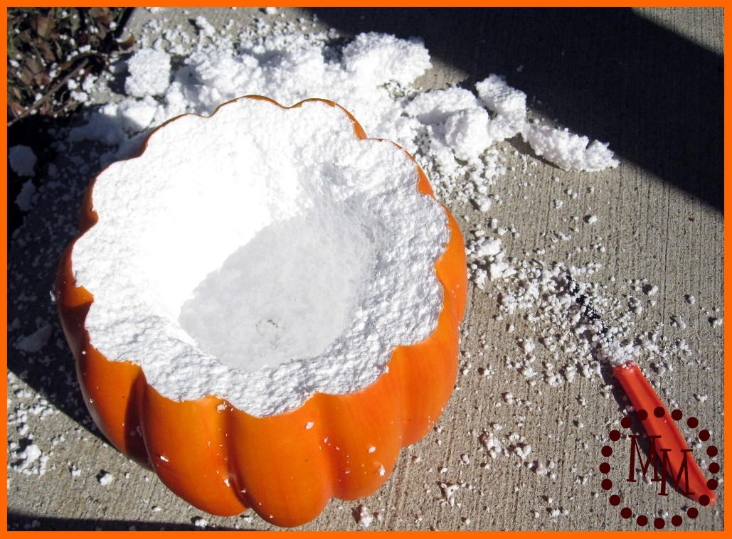 Anyway, I set about carving a hole in the center of the pumpkin which made quite the mess with all of the styrofoam.