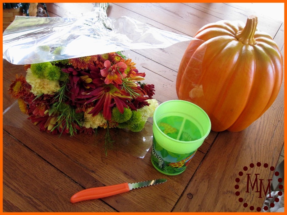 I also purchased a fall bouquet and grabbed my pumpkin knife and one of my son’s plastic cups.