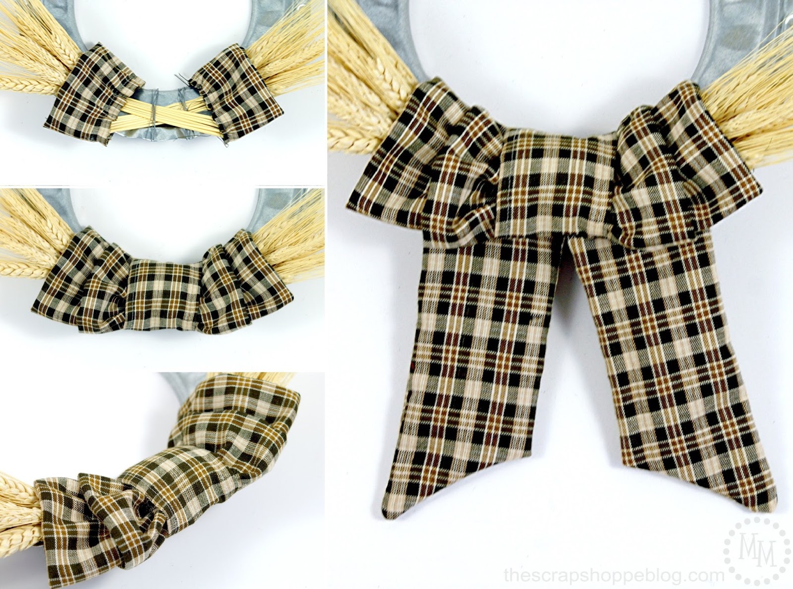 To create the ribbon, wrap two pieces of the bow around the wheat and storm collar. Hot glue the fabric together at the back of the wreath. Repeat with the last two piece of the bow by overlapping slightly with the first two pieces of fabric. Wrap the middle piece around the wreath, covering the edges of the bow. Hot glue in place. Hot glue the two ribbons to the back of the wreath.