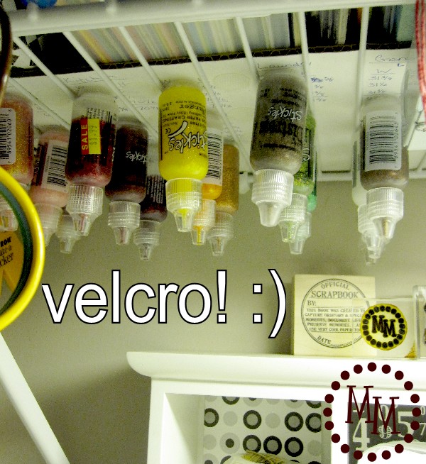 Incidently, I store my glitter glues upside down via some Velcro under a shelf so that 1) They are always ready to be used at any time. No waiting for the glue to fall to the tip! and 2) They are clear of the desktop leaving me space to clutter it with other items. 🙂