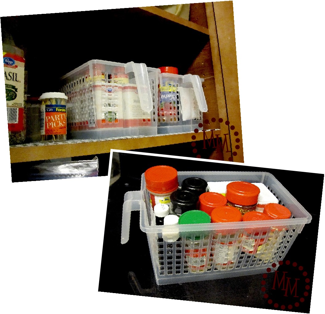 I picked up a couple of these small plastic baskets with handles to use for my spice storage. I do not have a pantry {boo! hiss!} so I have to make the most of my cabinets. The spices that don’t fit on my wall-mounted spice rack have to go in the cabinet and that shelf is above my eye level. These baskets are easy in and easy out of the cabinet!