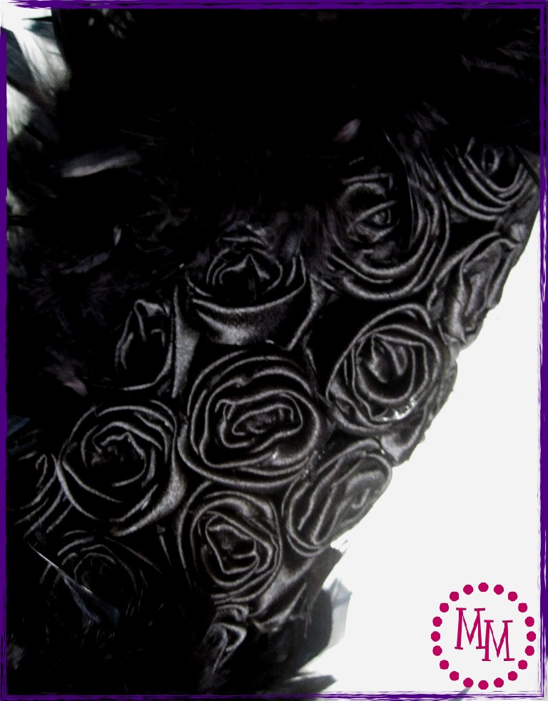 I wrapped a wreath form with black material. Then added a black feather boa. I spaced the boa out that I had 5 sections to my wreath.