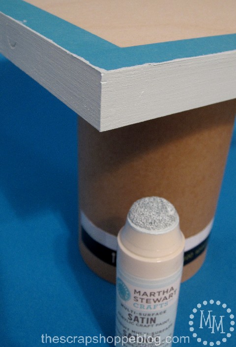 I taped off the front of the canvas with stencil tape and painted the edges with a fun satin paint called sea lavender which looked like a pale aqua. I used a Martha Stewart foam pouncer top to paint onto the wood. These things are so cool! You just take the cap off of the paint and screw on the pouncer top. Easy peasy! I gave the wood 3 light coats of paint.