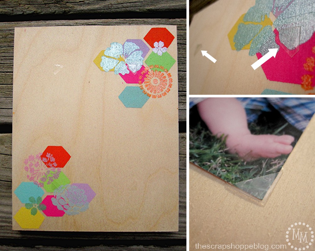 I wanted to be able to change out the photo I put on the canvas so I added some clear photo corners to the wood. I’ve used them in other projects and know that they are nice and sticky and will definitely not fall off of the wood.