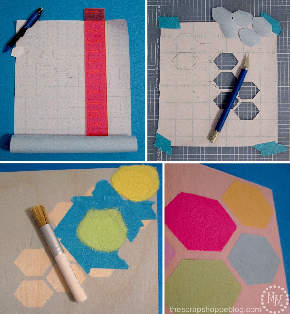 I decided I wanted to make my own stencil so I took advantage of the adhesive stencil film that was included in my goodie bag. I made a hexagon template out of cardstock and traced the pattern on the back of the stencil film. I used an X-acto knife to cut out the pattern.