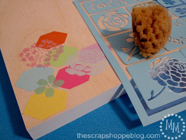 Because I was itching to try them out, and I thought they would add extra interest, I also painted on some of the adhesive floral stencils on top of the hexagons. For the florals I used the same colors of paint but in the pearl sheen to make them softer. I used the sea sponges to paint these stencils.