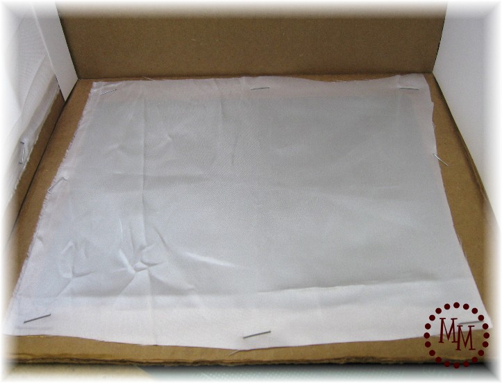 5. Cut your white material (as you can tell, I didn't even bother to iron mine!) so that it slightly larger than the squares you cut out of your box. Staple the material to the box. Alternatively you can use a hot glue gun to attach the material to the box.