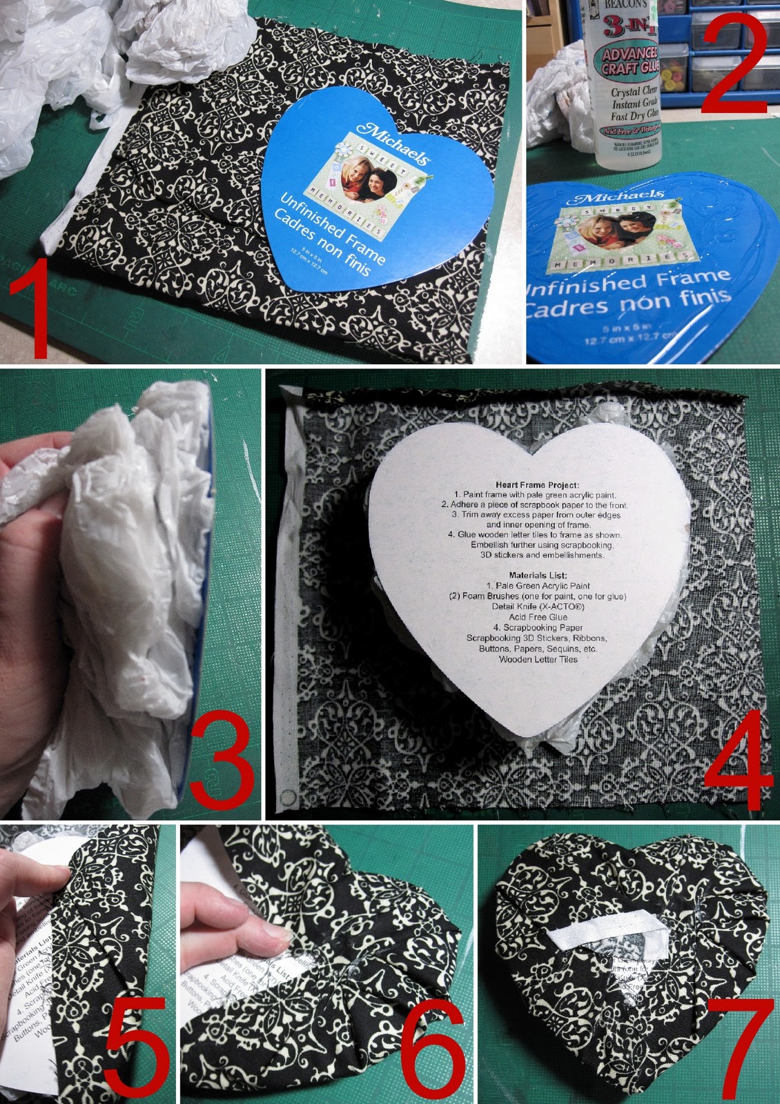 1. I started with a damask fabric remnant I had in my stash, the cardboard heart that came with the frame, and a couple of plastic grocery bags.