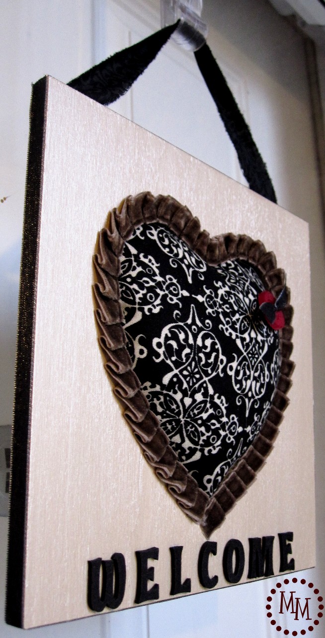 Also in my stash-o-crafts was a strip of fabric that just happened to have a similar damask pattern as the fabric on the heart so I thought it would be perfect to use for hanging the frame.